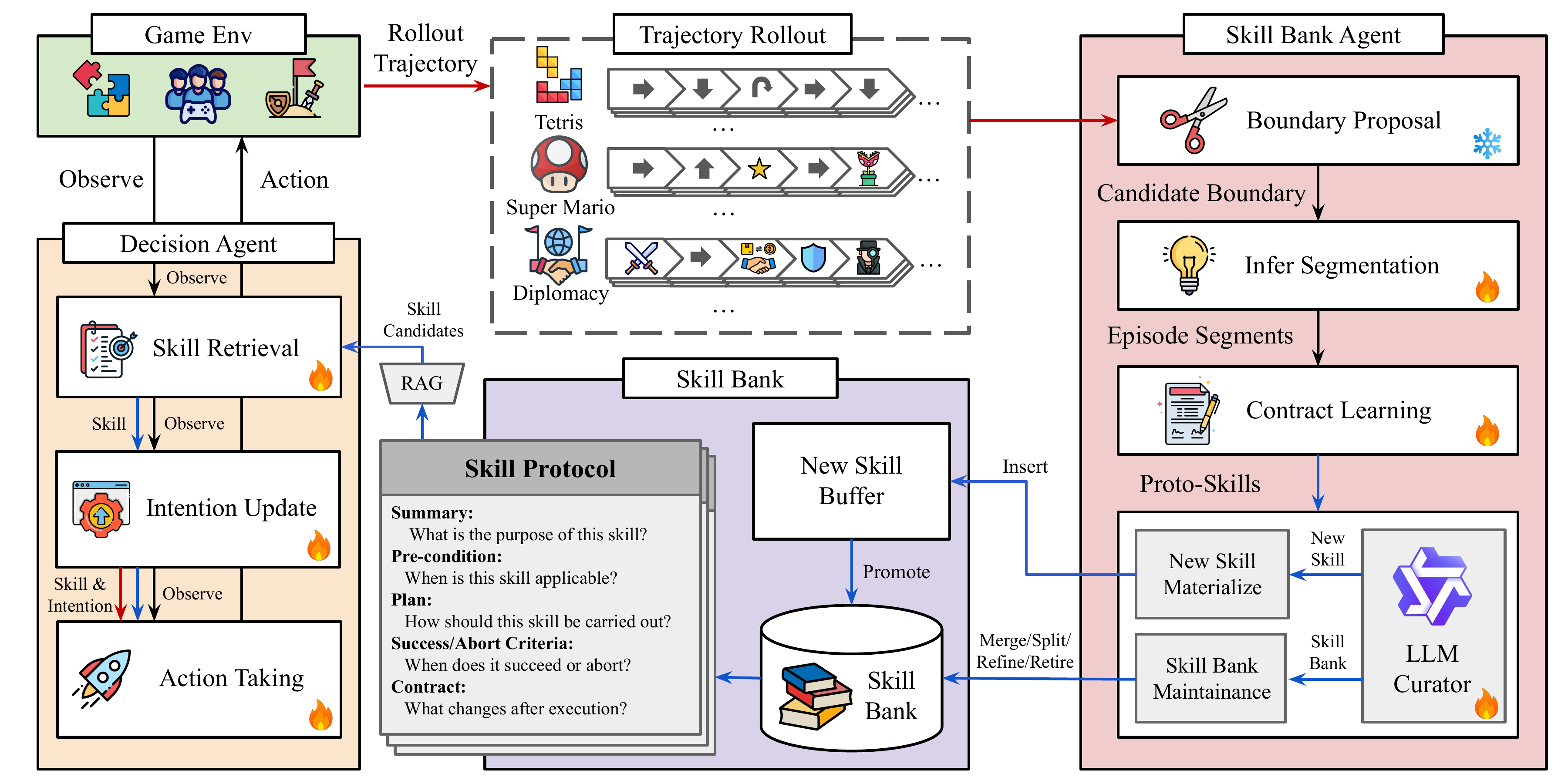 | Apr 2026: | We release a technical report introducing COS-PLAY, a co-evolution framework where an LLM decision agent and a skill bank agent jointly improve through GRPO, achieving over 25.1% average reward improvement across six game environments with an 8B model against frontier LLM baselines. The project webpage is released here. |