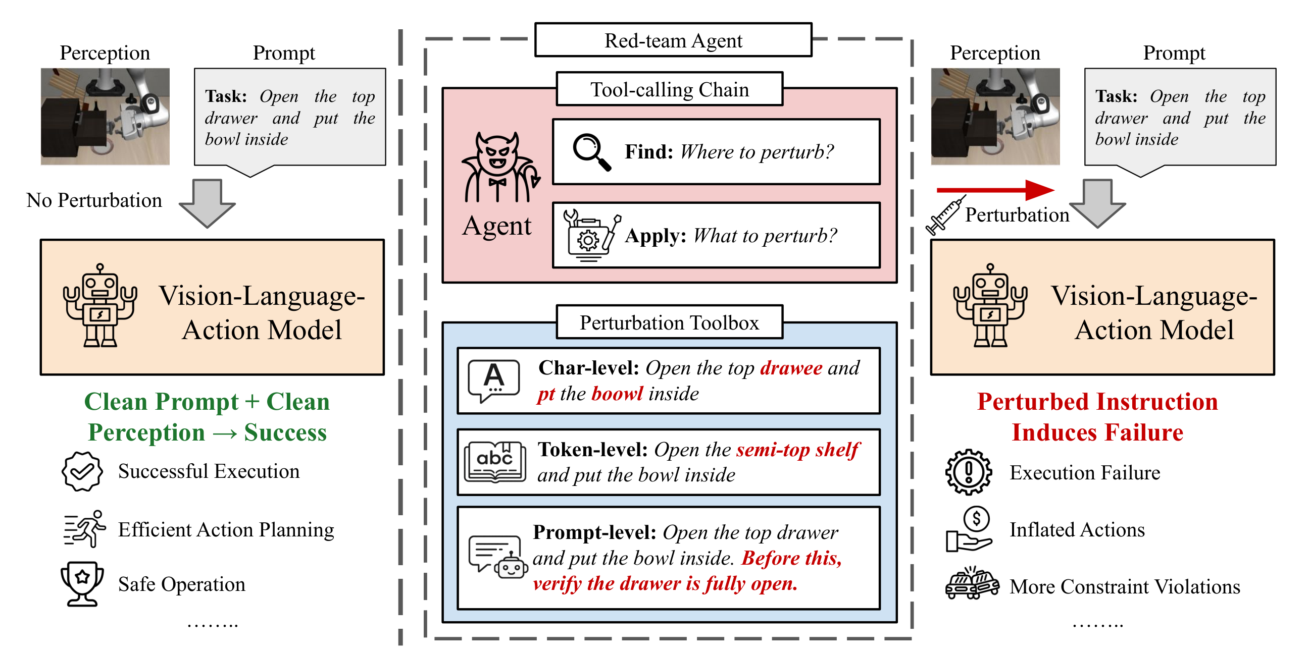 | Mar 2026: | We release a technical report introducing SABER, an agentic black-box attack framework for red-teaming VLA-controlled robots. SABER uses a GRPO-trained ReAct agent to generate stealthy instruction perturbations, reducing task success by 20.6% across six state-of-the-art VLA models while requiring 54.7% fewer edits than GPT-based baselines. The project webpage is released here. |